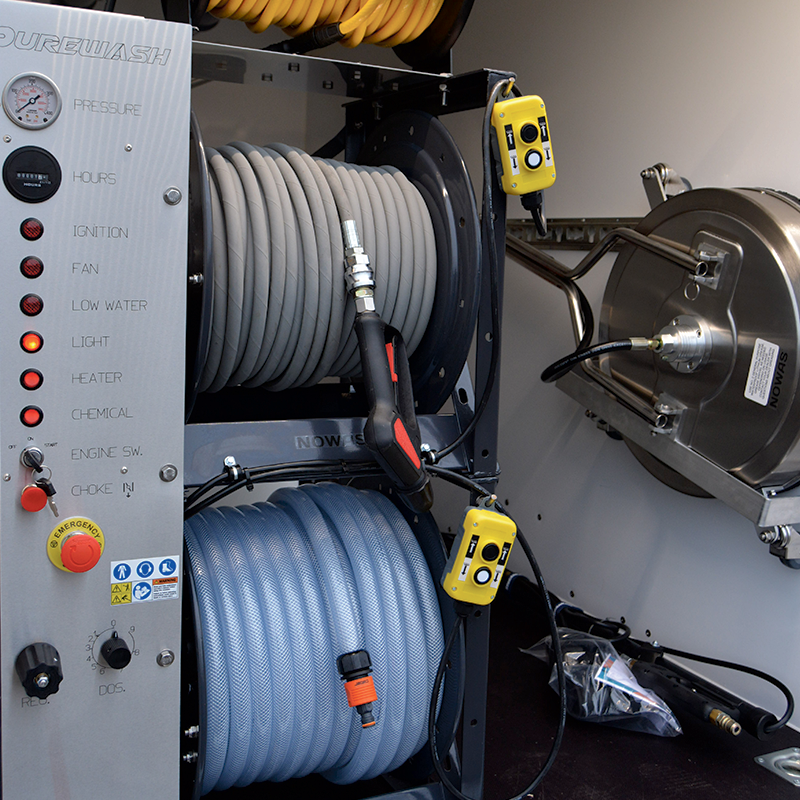 Vælg mellem elektrisk højtryksslangehjul eller standard manuelt højtryksslangehjul. Du kan også tilvælge integreret imprægneringssystem.